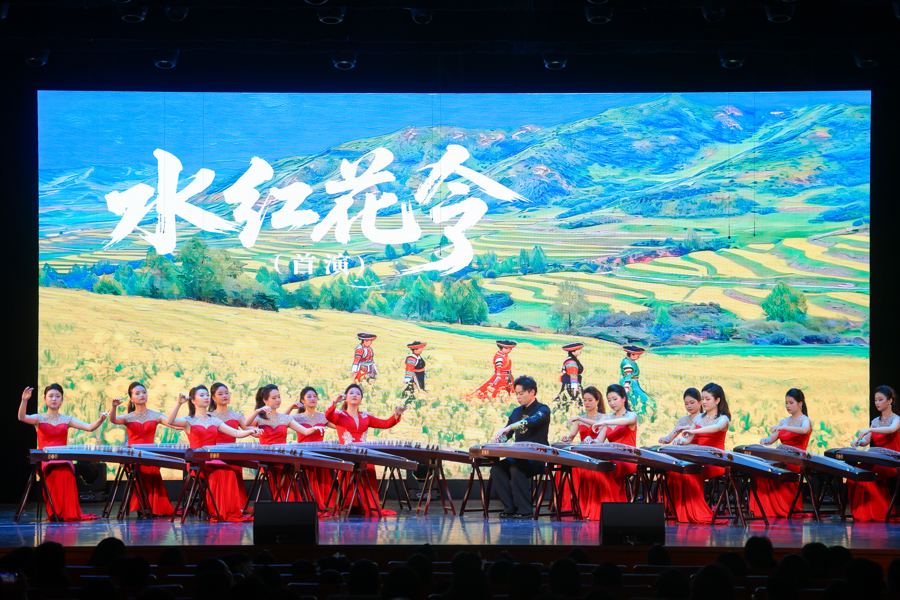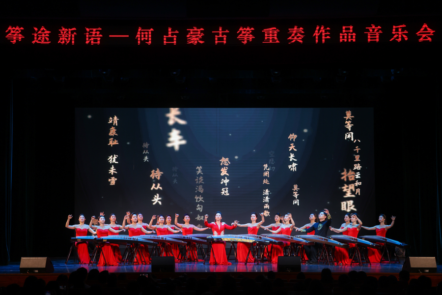 音乐会曲目体系鲜明,折射出何占豪一以贯之的创作初心。红色经典编创系列中,《打靶归来》《映山红》《我和我的祖国》以古筝重奏的层次化表达,让红色旋律焕发当代质感。民族民歌改编板块,《苹果熟了》及2025年新作《水红花令》《太阳还在半坡房》《酒歌》融汇多元地域与民族风情,尽显中华音乐的丰富肌理。专为青少年打造的《燕南飞》《茉莉芬芳》等新作,贴合青少年演奏特点,降低民乐入门门槛,让更多孩子在合奏中感受国乐之美。演出以《不忘初心》开篇,《满江红》收尾,一气呵成。