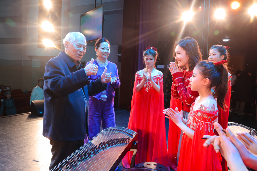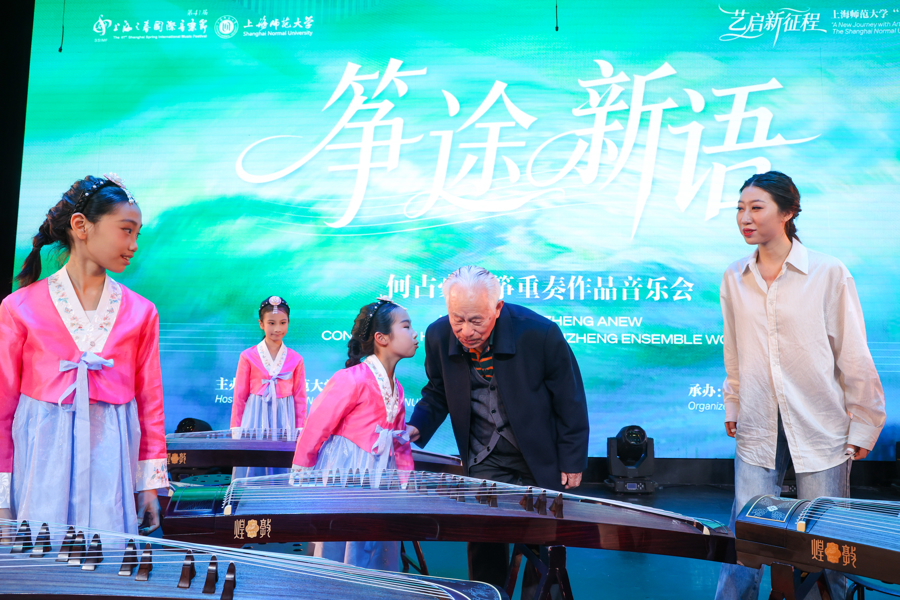 4月11日,第41届上海之春国际音乐节上海师范大学艺术展示周迎来一场民乐盛宴——“筝途新语”何占豪古筝重奏作品音乐会在上师大音乐厅温情上演。92岁高龄的著名作曲家、小提琴协奏曲《梁祝》创作者之一何占豪亲临现场指导,与观众一同见证古筝艺术的传承与新生。