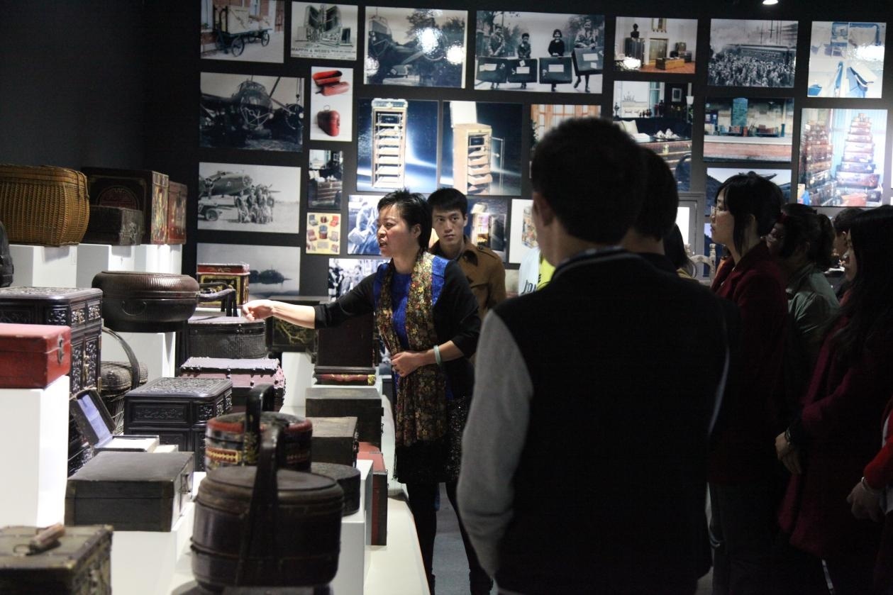 邵宝玲在她引以为傲的箱包博物馆中讲解