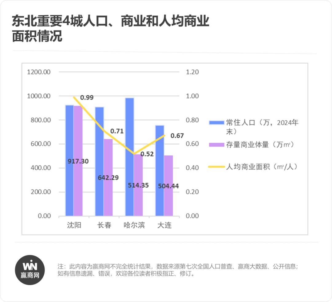 第一个特点:供给克制,存量博弈。把大连放在东北四个主要城市里横向对比,沈阳、长春、哈尔滨常住人口均处于900万+量级,大连754.4万为四城最低;商业存量方面,大连人均商业面积0.67㎡/人,高于哈尔滨。这意味着市场饱和度更低、内卷程度更轻、项目存活率更高。近年少有新增供应,市场以存量焕新、提质增效为主,头部项目更容易聚拢资源、形成显著优势。