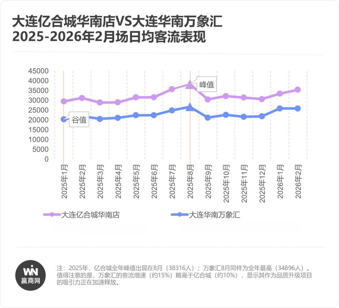 据赢商大数据,亿合城月均客流始终领先于万象汇,2025年同比增长约10%,2026年1-2月继续攀升至3.5万人;万象汇增速更快,2025年同比增长约15%,2026年1月客流同比增长27%,显示出北部家庭消费升级需求的加速释放。更重要的是,两大项目客流同步走高,春节旺季双双受益,万象汇的崛起并未分流亿合城,反而共同把北部家庭消费的蛋糕做大。