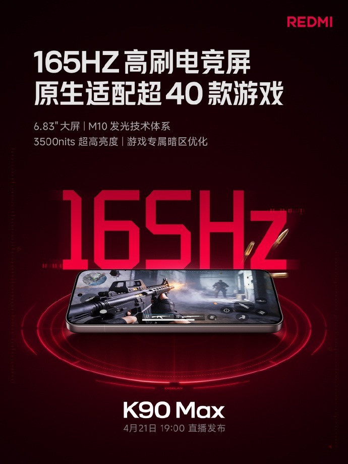 4月13日消息,小米今日正式官宣,REDMI K90 Max将于4月21日晚19:00举办线上发布会。该机定位全新游戏性能旗舰,官方宣传语为“性能魔王,探索性能新极限;风冷双芯,重塑散热新标准”,将在散热、性能、屏幕、触控、续航等维度全面升级,是小米旗下首款搭载风冷主动散热方案的手机。