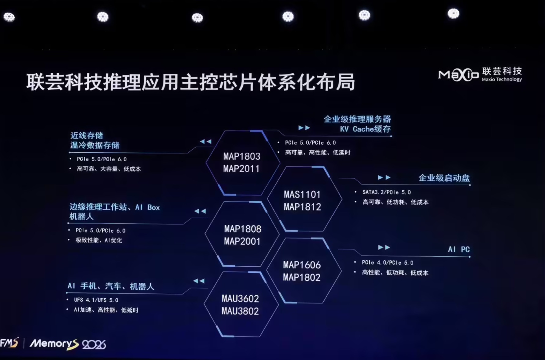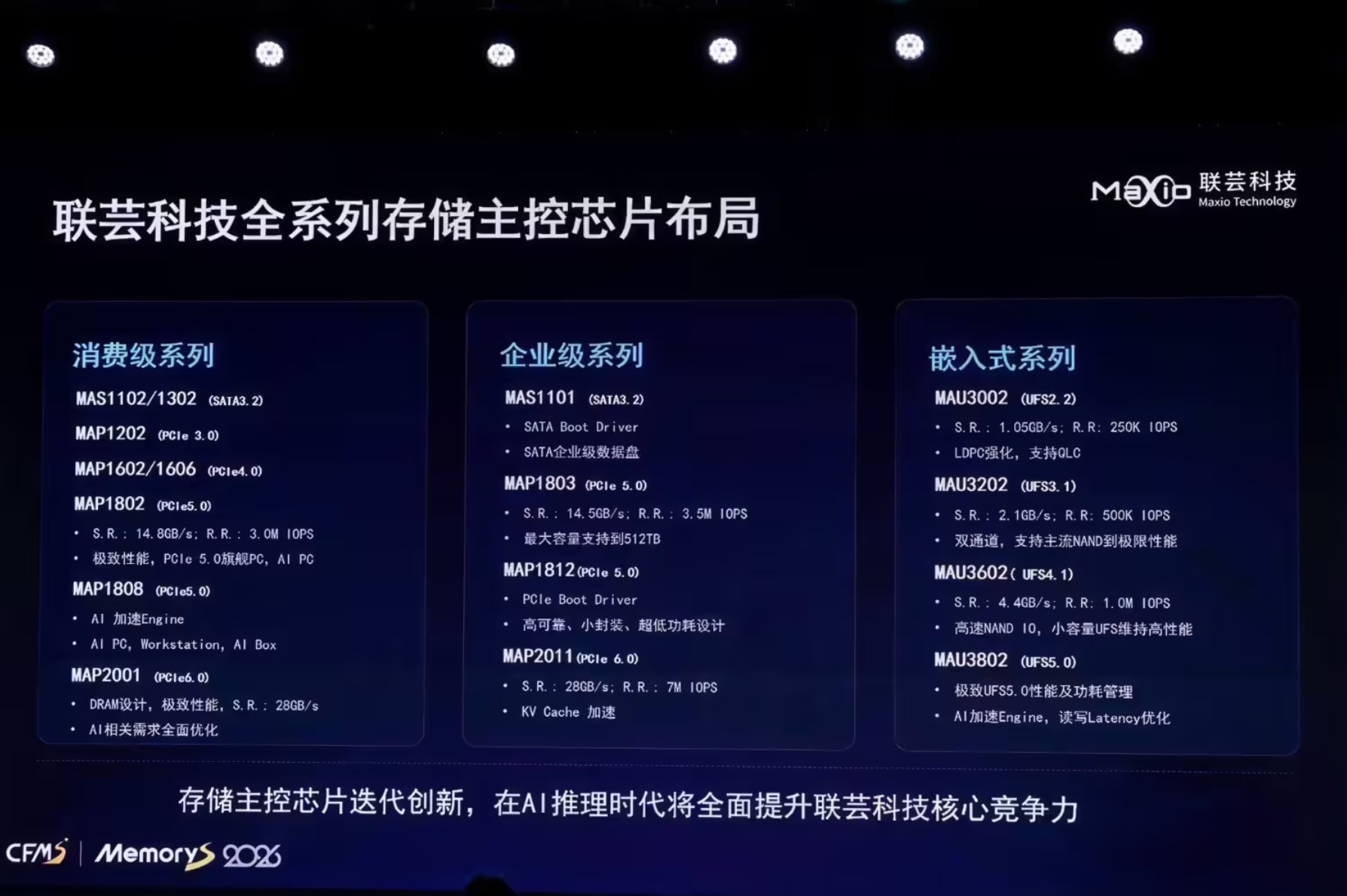 事实上,联芸此次并非单点突破,而是展现了覆盖消费级、企业级、嵌入式全场景的完整存储主控布局,且所有新品均将 AI 优化作为核心设计目标。在 PCIe 5.0 赛道,联芸即将推出搭载专属 AI 加速引擎的 MAP1808 主控,瞄准高端 AI PC、工作站和 AI Box 市场;企业级领域,同代 PCIe Gen6 主控 MAP2011 同样实现 28GB/s 顺序读取速率,随机读取性能更是达到惊人的 7M IOPS,特别加入 KV Cache 加速技术,专为企业级推理服务器的温冷数据存储和大模型缓存场景量身打造,最大容量支持高达 512TB;嵌入式市场则推出 MAU3802 UFS 5.0 主控,通过优化读写延迟和能效比,成为 AI 手机、智能机器人等终端设备的理想存储解决方案。