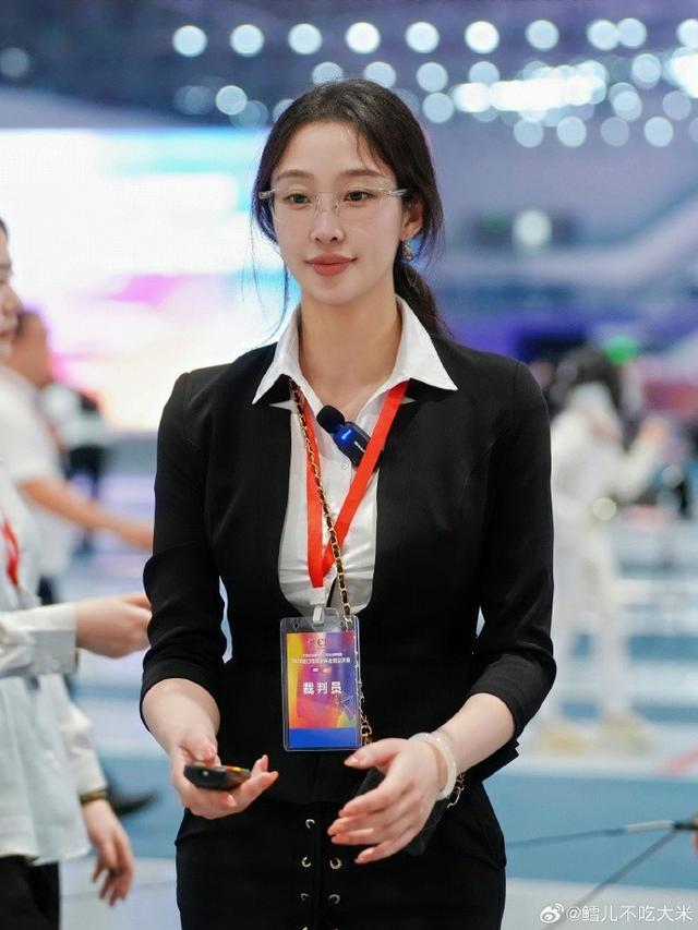秦雪在厦门市青少年击剑公开赛里担任裁判,她身穿裁判的职业装,上身是小西装搭配白衬衫,西装是明显修裁过的,在腰身处更显身材。而下身则是过膝长裙,更体现知性的女人味。