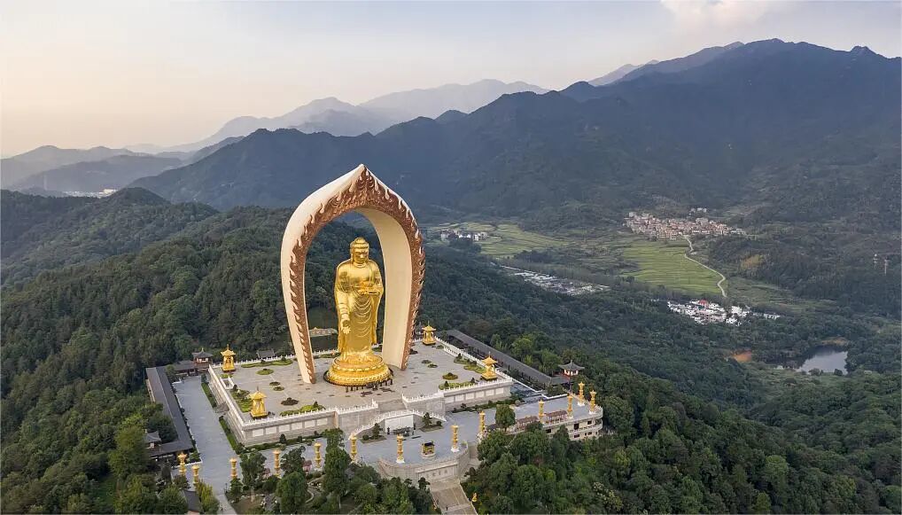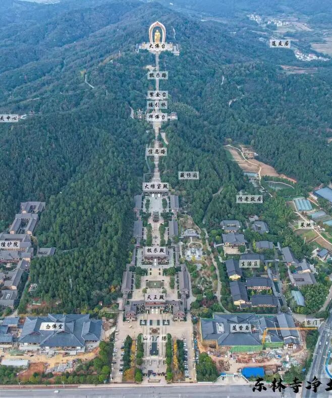 庐山东林寺净土苑地处庐山市温泉镇北,人文荟萃,风光秀美,集名山名寺之灵,揽名江名湖之胜。四周群山环峙,将东林大佛拱卫于中央,形成百岳朝宗的格局。
