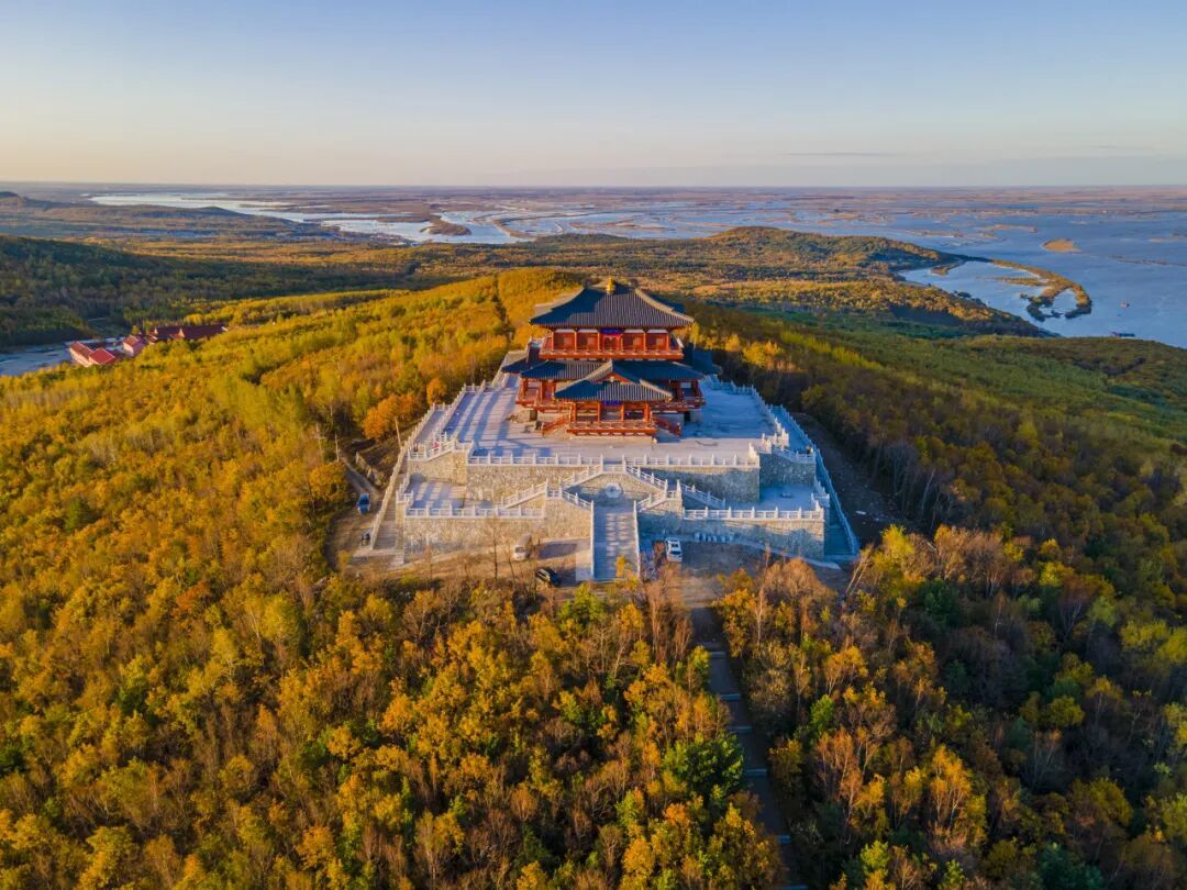 抚远东极阁全木构仿唐建筑,位于抚远市背山——南山公园之巅,伫立在伟大祖国的最东方,中华民族第一缕阳光升起的地方。东极阁犹如高昂的龙头,盘山路似龙身。祈愿中华巨龙腾飞,体现国之东、运之极——国运东极,中华国运昌明的愿景。