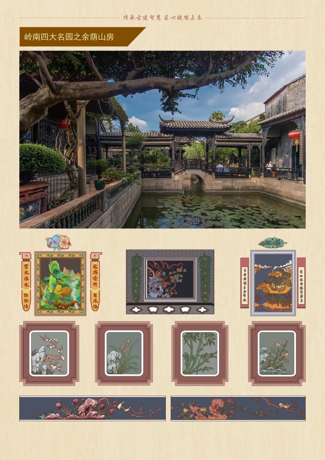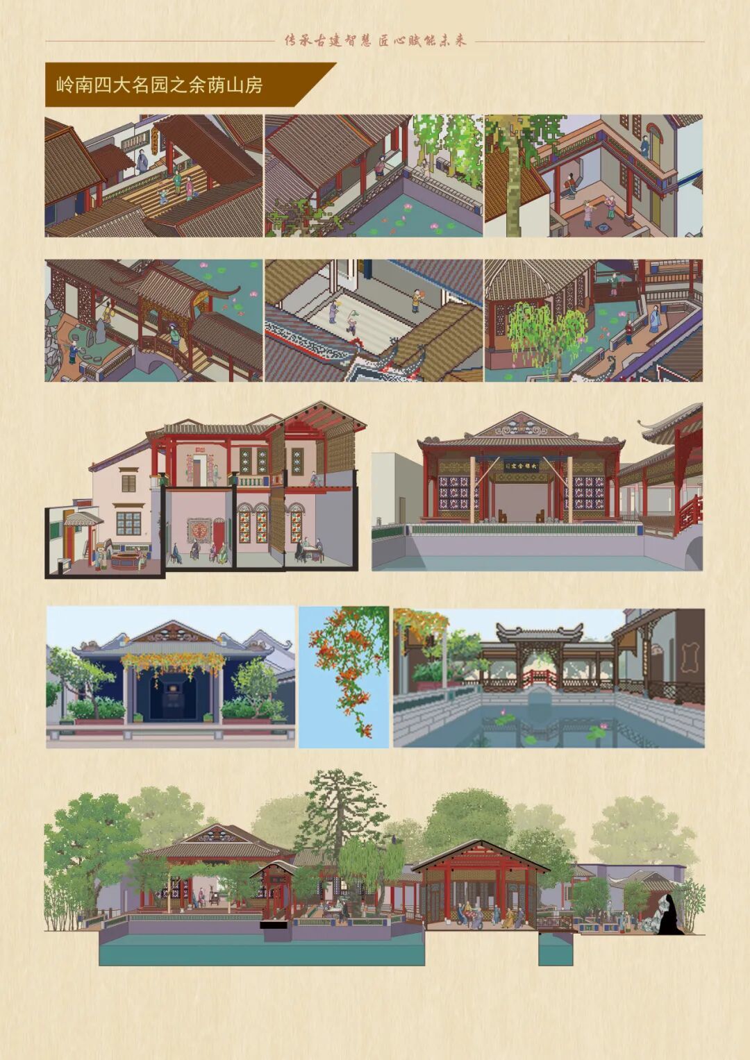 以余荫山房为切入点,探讨广东园林空间从学术研究到公共认知的转化路径。通过借鉴清末外销通草画风格与像素画技法,将园林空间、灰塑、满洲窗等要素进行图像阐释,探索传统园林文化在当代的视觉转译与活化传播策略,为岭南园林遗产的公众认知提供新路径。