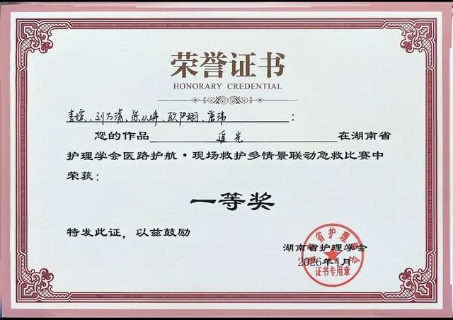 近日,在湖南省护理学会现场救护专业委员会举办的2026年学术年会“医路护航·现场救护多情景联动急救比赛”中,长沙市第四医院急诊急救中心代表队凭借过硬的专业素养、默契的团队协作和出色的临场发挥,在56个队伍中脱颖而出,作品《追光》成功斩获一等奖。