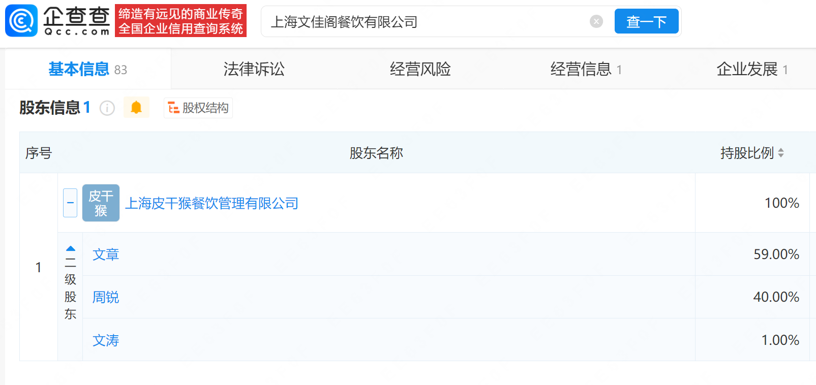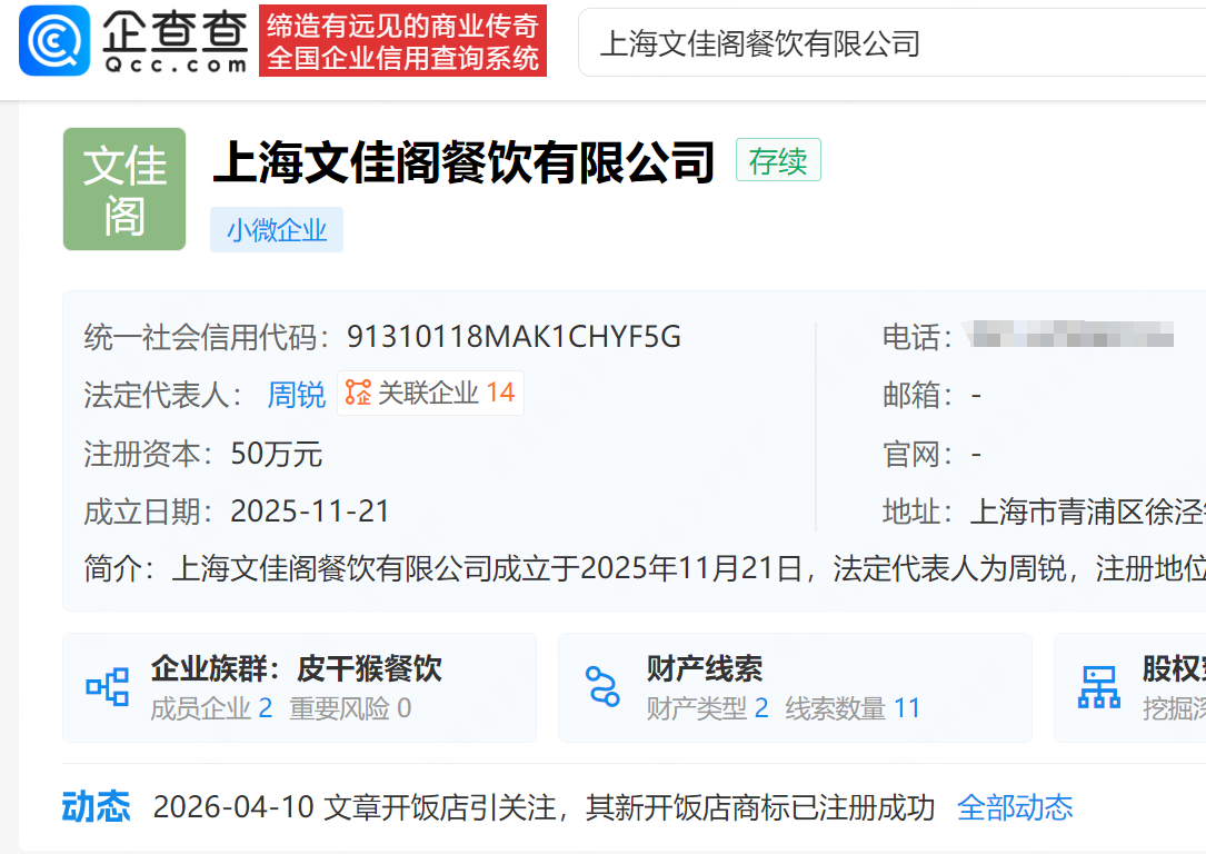 企查查APP显示,“八号院儿”面馆关联的上海文佳阁餐饮有限公司成立于2025年11月,法定代表人为周锐,注册资本50万元,经营范围为餐饮服务,由上海皮干猴餐饮管理有限公司全资持股,后者由文章持股59%。知识产权信息显示,该公司已申请注册多枚“八号院儿、“Wen's”商标,国际分类涉及食品、广告销售等,部分商标已注册成功。