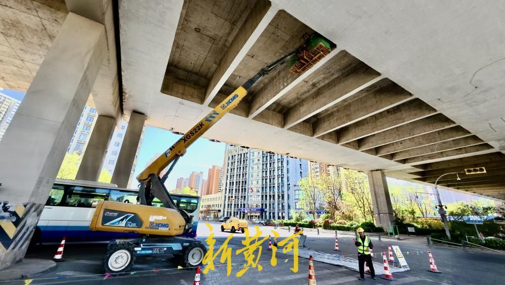 破碎后的渣石随即被清运出场,为下一步人行道重新铺装创造条件。 与此同时,主桥及匝道下方的裂缝加固作业也在同步实施。施工人员操作升降机抵达桥梁底部,采用压力注浆法对发现的裂缝进行封闭和结构加固。该工艺能够有效填充裂缝内部,增强混凝土结构的整体性与耐久性,防止渗水和进一步开裂。