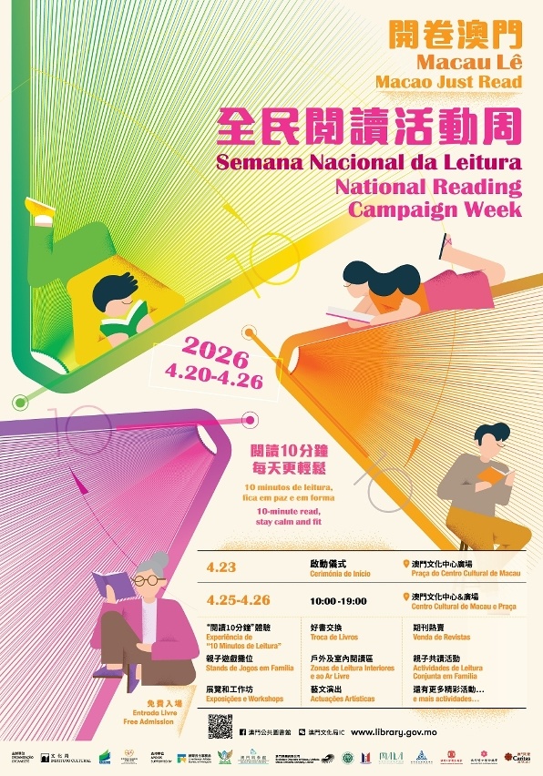 為落實推動國務院頒布的《全民閲讀促進條例》及每年4月第四周的“全民閲讀活動周”,同時響應4月23日“世界閲讀日”,文化局聯同教育及青年發展局、社會工作局及多個民間社團,於4月20日至4月26日期間盛大舉辦“開卷澳門‧2026全民閲讀活動周”(以下簡稱“全民閲讀活動周”),攜手推廣全民閲讀風氣,共建“閲讀之城”。