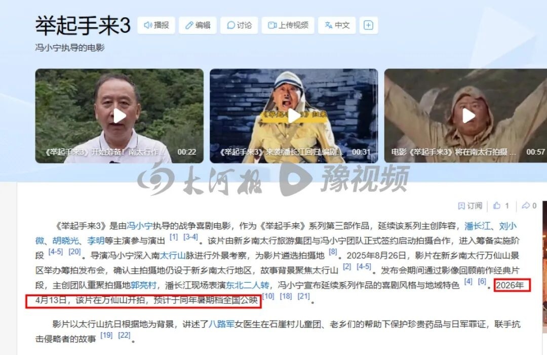 另据新乡广播电视台官方账号,4月13日,抗战喜剧电影《举起手来3》开机仪式在河南新乡南太行・万仙山景区主题碑广场举行。导演冯小宁携主演刘仪伟、刘小微、潘长江、胡晓光、李明等主创团队出席开机仪式。