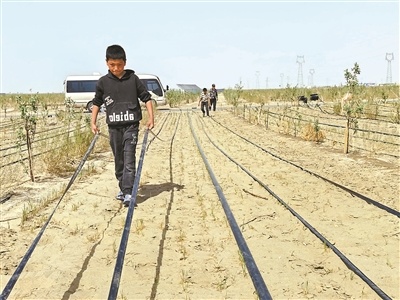 14岁的努尔麦麦提正和两个年龄相近的兄弟帮着姐姐、姐夫布置水管。他熟练地在水管上打孔、插上阀头、连接水管,弟弟则从土地那头一手捋住一根水管,摇摇晃晃走来,边走边调整水管的位置。孩子们的手背皮肤在风吹日晒下变得黝黑,但却乐此不疲。努尔麦麦提说,“我们讨厌沙子,想让这里变成绿色。”