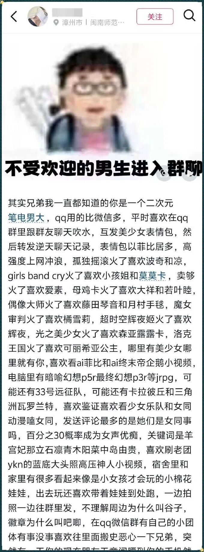 后来「笔电男大」这个词逐渐扩散,沾上了二次元、少女乐队、声优噶起等元素,有段时间变成国内版的「弱男」「宅男」刻板印象。