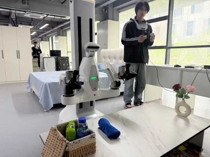 在训练场内,数据采集员刘新远正熟练操作着机械臂进行物流场景的抓取演示。他告诉记者,一条完整的数据采集流程大约30秒,每天单台机器人需要采集约4小时的有效数据。“我们就像是机器人的‘教官’,通过成百上千次重复动作的数据投喂,几个月后,这台机器人就能在这个特定场景下实现自主化操作。”