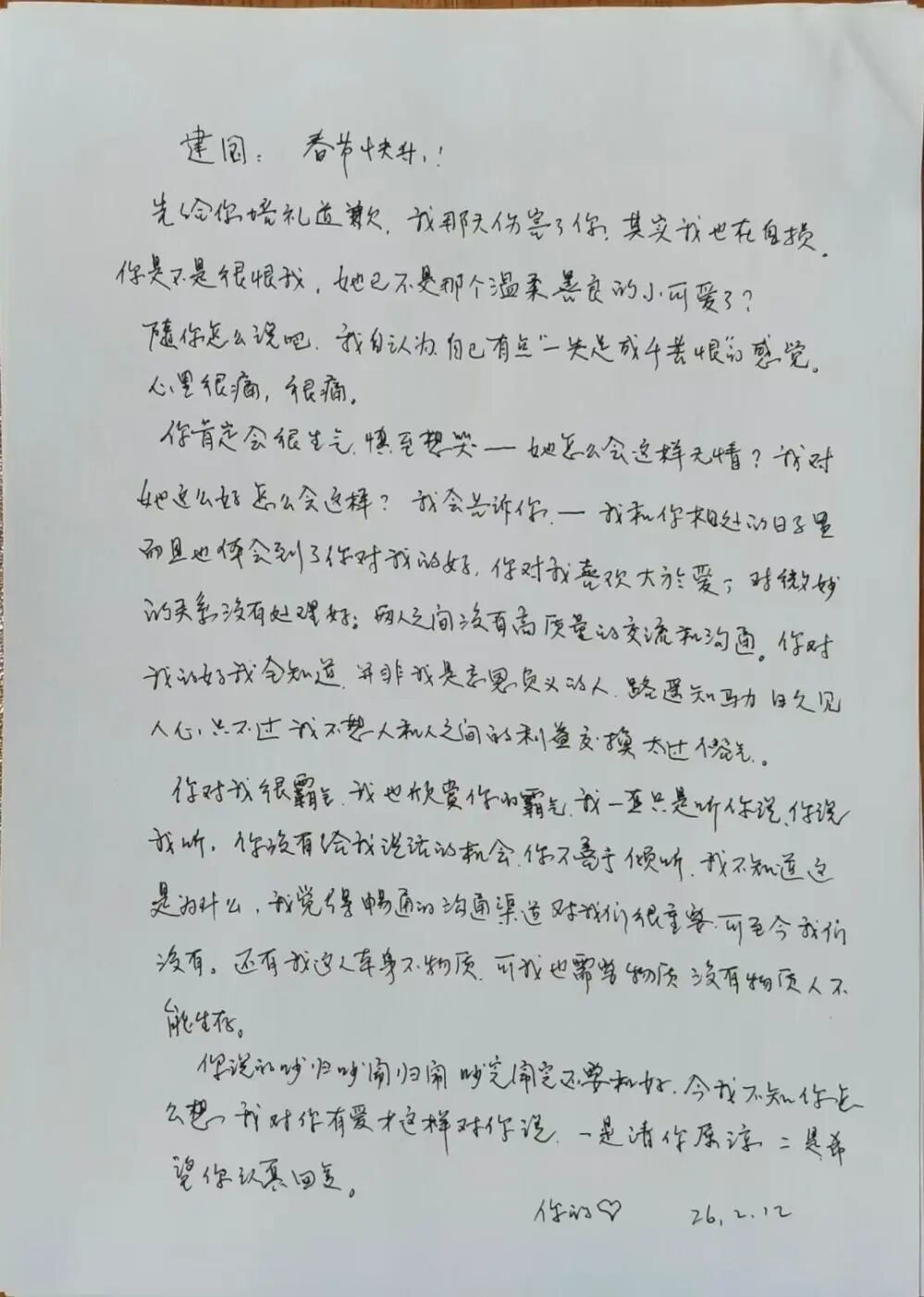恋爱中也会有不愉快,2026年2月,王彩华跟建国闹了矛盾。思来想去,她决定写一封信以表心意,希望重归于好。她把一张A4纸写得密密麻麻,“我对你有爱才这样对你说,一是请你原谅,二是希望你认真回复”。信的署名是:你的♥。