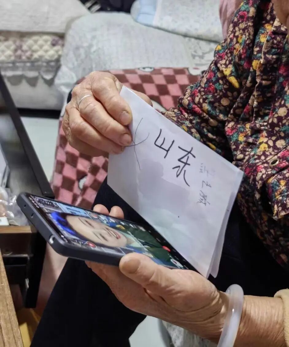 久而久之,陈玉兰自己摸索出一种新的对话方式。她把视频常问的几个问题——姓名、联系方式、家庭住址——提前用记号笔写在纸上,等下次再遇到类似的问题,她不用一遍遍回答,只需举起纸张对着手机展示,再“放心地划走”。