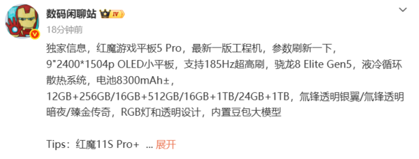 性能配置有望成为红魔游戏平板5 Pro的“核心杀手锏”。该平板预计将搭载高通骁龙8 Elite Gen5旗舰移动平台,配备液冷循环散热系统。存储方面,红魔游戏平板5 Pro预计将提供极为丰富的选择,除了12GB+256GB、16GB+512GB和16GB+1TB版本外,更是提供了24GB+1TB顶配组合。