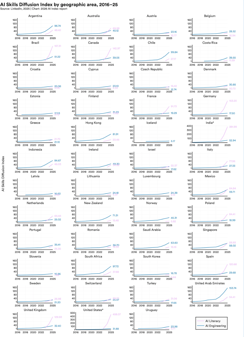 在全球范围内,AI工程技能增长最快的国家,反而是阿拉伯联合酋长国、智利和南非。