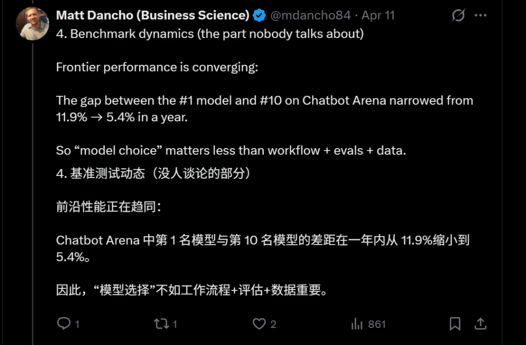 截至2026年3月,Anthropic的顶尖模型虽仍保持领先,但优势已收窄至仅2.7%。
