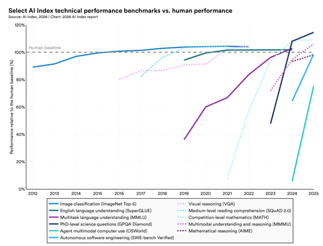 2025年,业界生产了超过90%的知名前沿模型,其中多个模型在博士级科学问题、多模态推理和竞赛数学方面现已达到或超越人类基线。