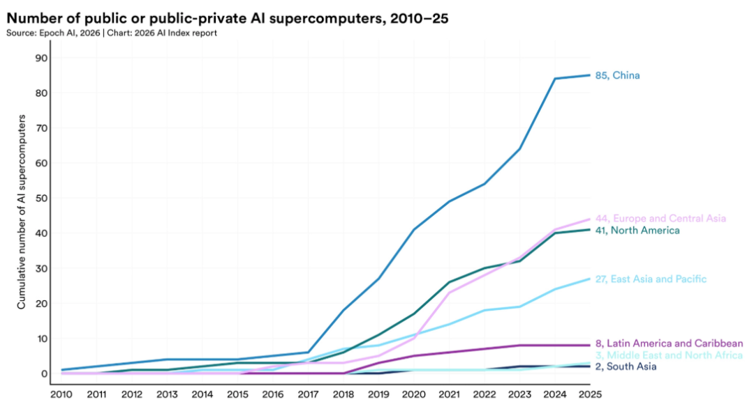 为了把AI能力尽量掌握在本土体系内,发展中经济体持续扩展国家级AI战略,同时政府主导的AI超级计算投资也在同步增长。