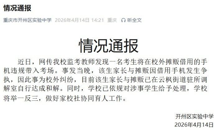 4月14日,重庆市开州区实验中学发布情况通报: