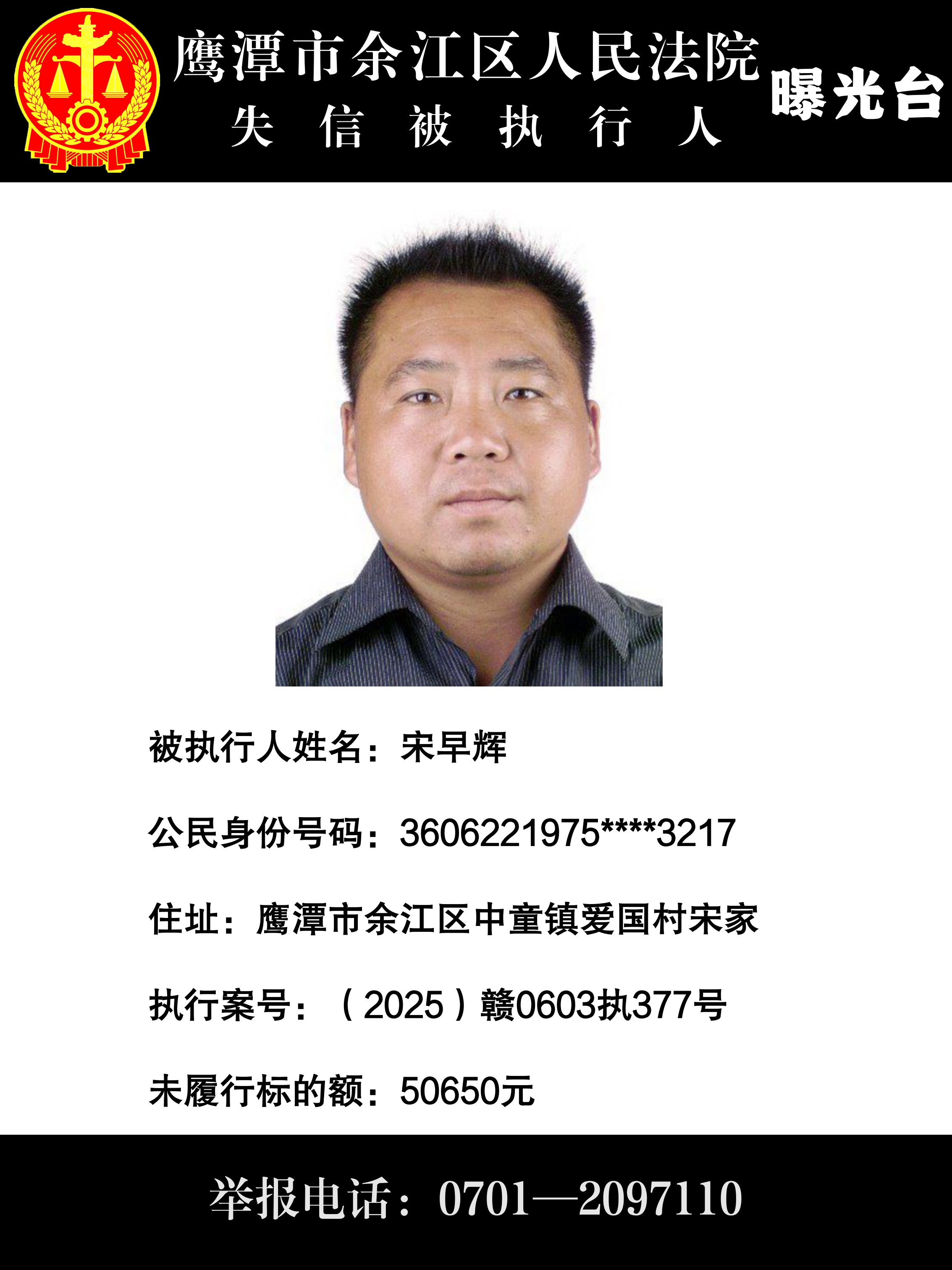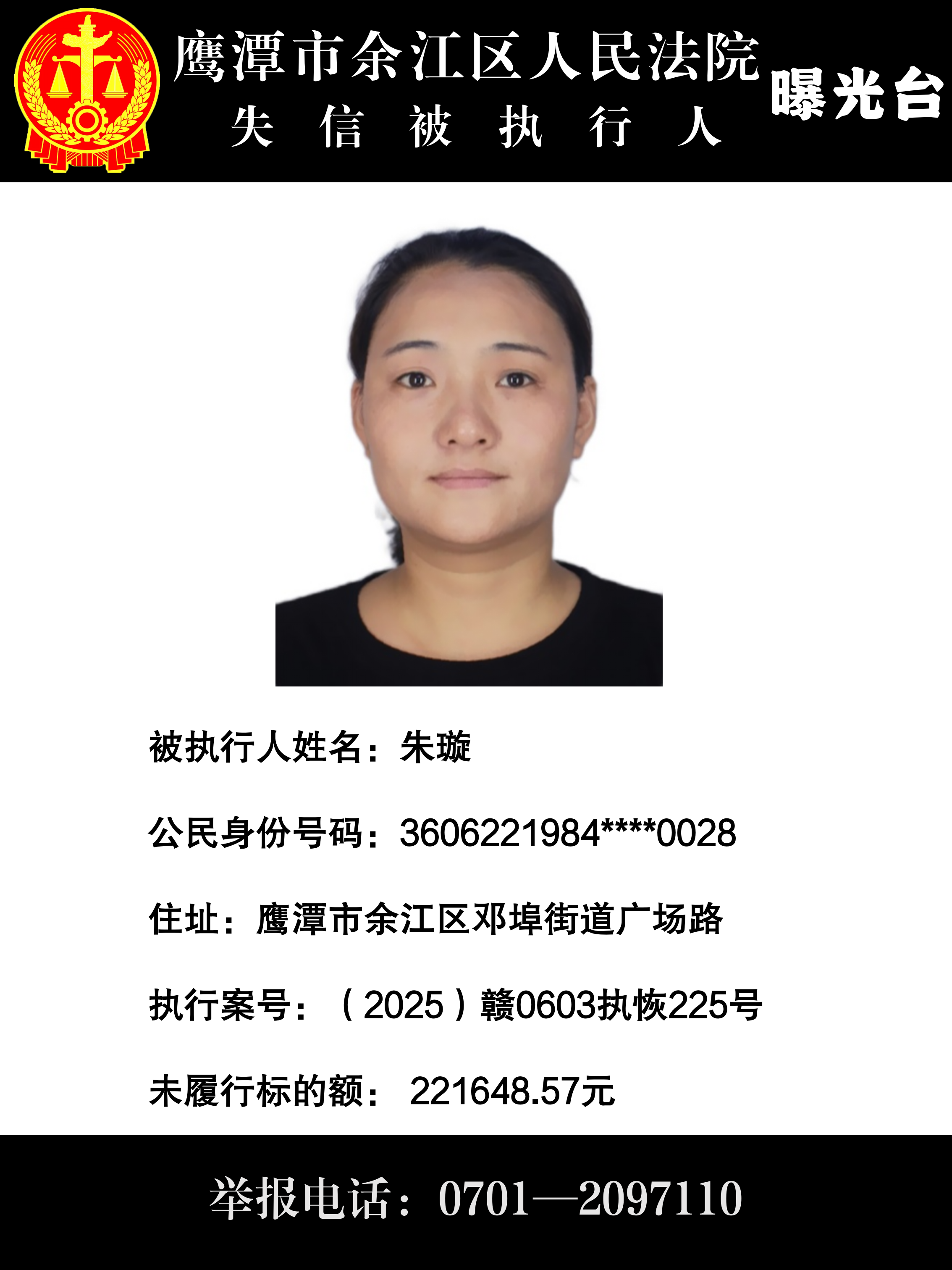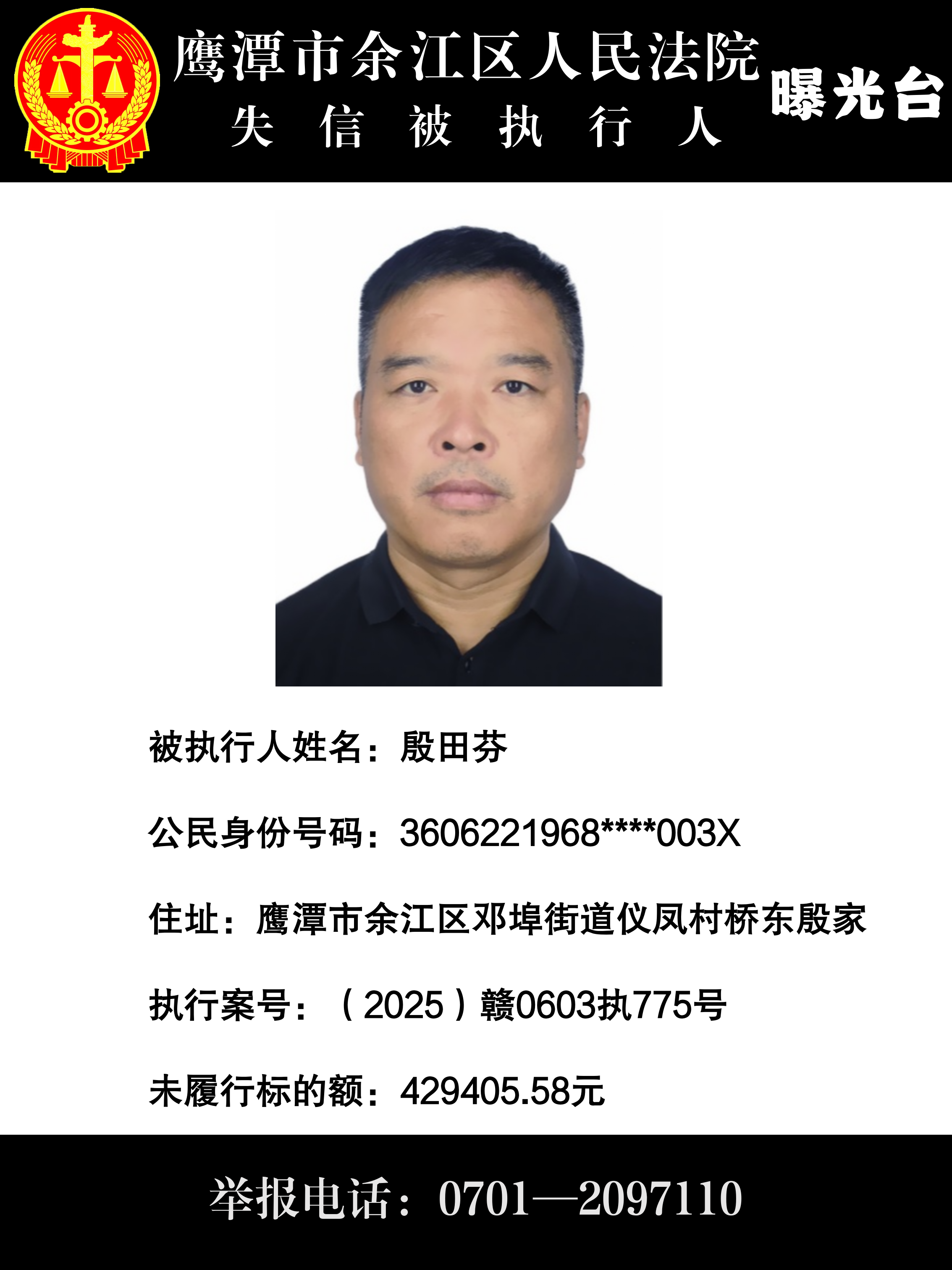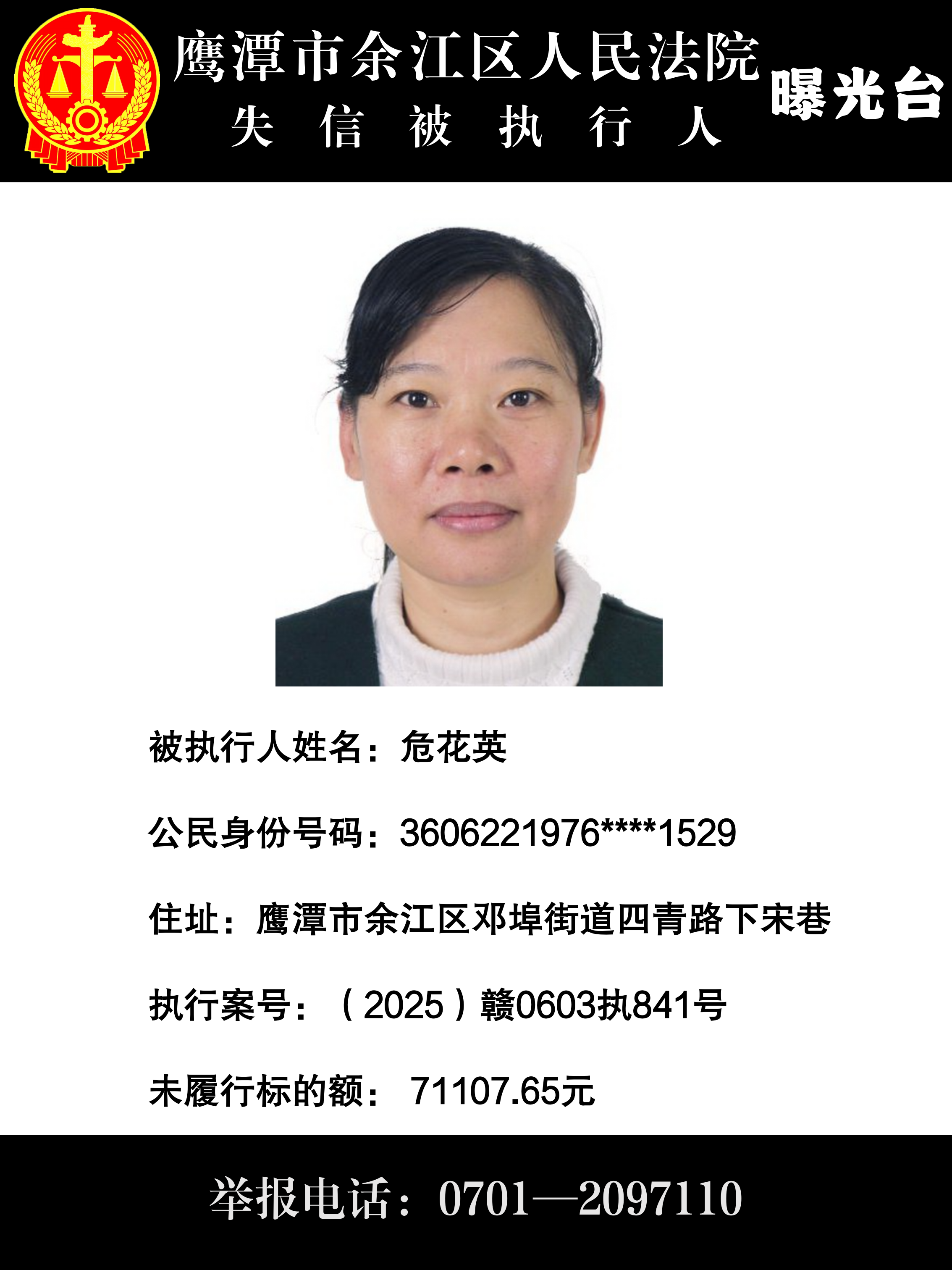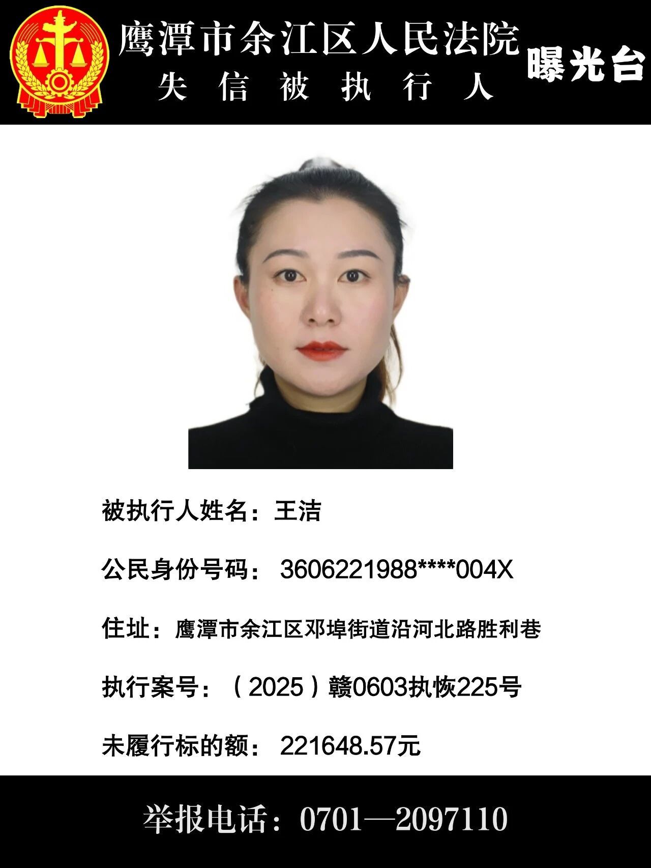 因上述被执行人不履行生效法律文书确定的义务,根据《中华人民共和国民事诉讼法》第二百六十二条之规定,现通过媒体公布失信被执行人相关信息。积极履行生效法律文书确定义务,或主动纠正失信行为的,法院将及时将其从失信被执行人名单库中删除。也欢迎通过举报电话:0701-2097110 举报被执行人的财产线索和下落,监督被执行人的高消费行为!