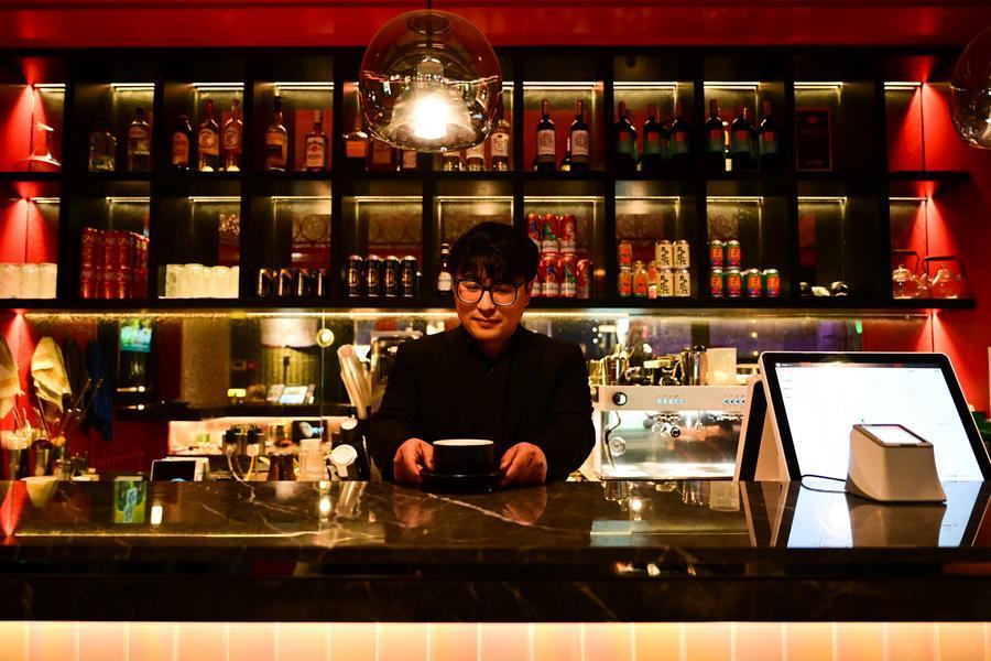 三克映画餐厅主理人汪静程为客人调制饮品。新华社记者 周牧 摄