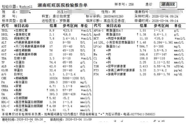 急诊医学科罗新意主任医师听取病情汇报后,立即完善静脉采血、颅脑CT、床旁超声等检查,予以心电监护、口服、静脉用药等对症支持处理。后续检查结果也显示,王先生多项指标异常。