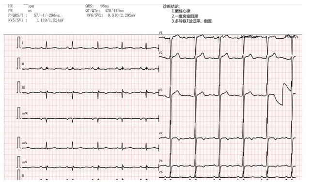 ▲心电图示:一度房室传导阻滞、多导联T波低平倒置