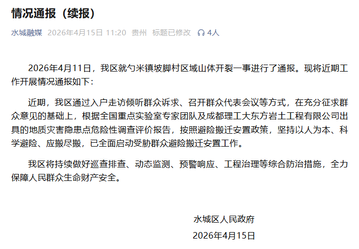 4月15日,贵州六盘水水城区人民政府发布情况通报。