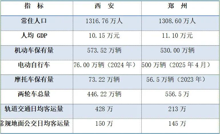 2017年,西安是全国第一个对摩托车解禁的中心城市,郑州则至今仍保留有摩托车的“禁限”政策。两地在人口规模、经济发展、地域区位等方面有较强的可比性。从下面这张表来看,如果将电动自行车与摩托车合并进行比较,西安解禁摩托车对于两轮车总量并没有明显的带动作用。由于相比郑州,西安建成区居住人口密度更高(每平方公里1.54万人,郑州为1.18万人),在全国仅次于深圳,更加适合公共交通出行,其两轮车数量甚至还略少于郑州。