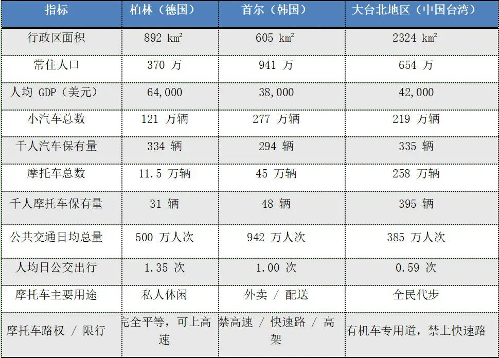 我国大台北地区(包括台北市和新北市)人口约654万人,摩托车保有量高达258万辆。相比之下,韩国首尔人口为941万,摩托车则只有约45万辆,千人保有量只有大台北地区的12%。可以说,两地在摩托车使用方面是天差地远。
