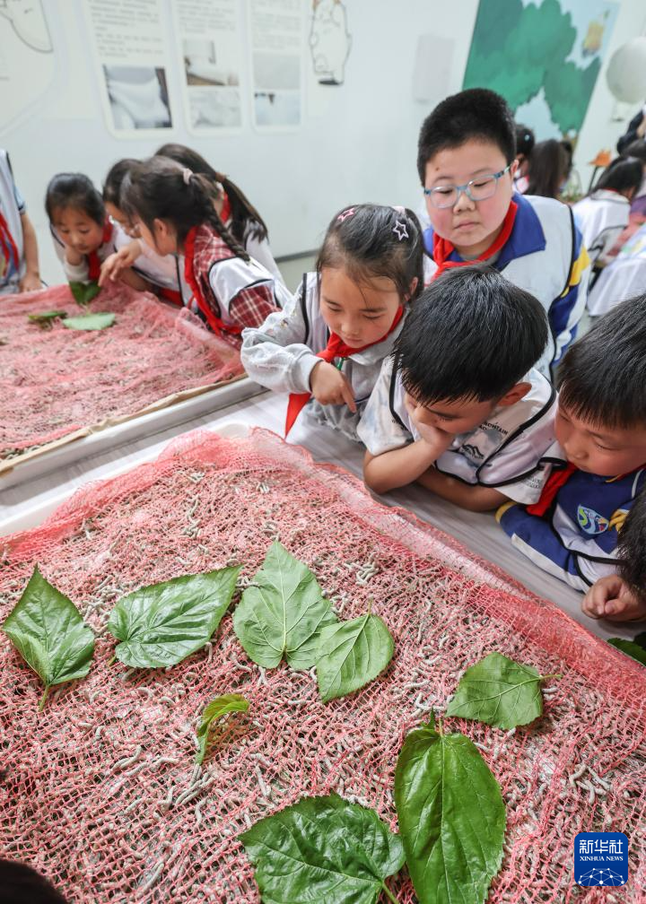 4月15日,参加研学活动的小学生在研学实践中心蚕桑乐园观察蚕宝宝。