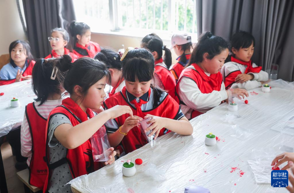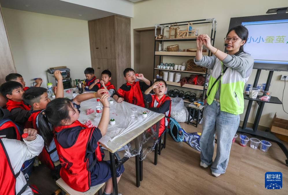 4月15日,参加研学活动的小学生在研学实践中心蚕俗文化园学习蚕茧手工艺品制作。