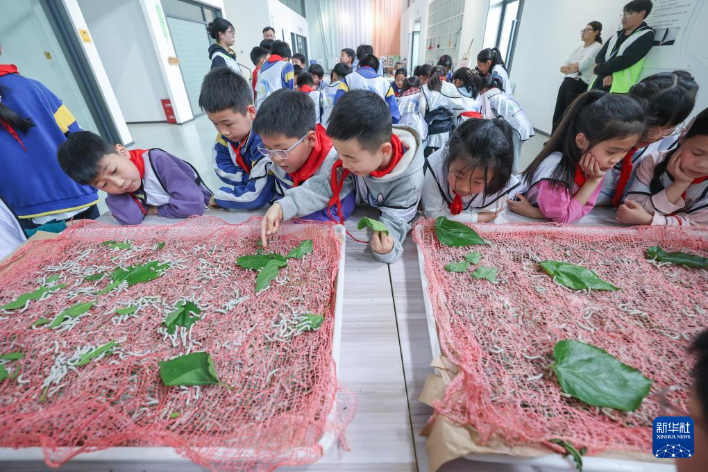 4月15日,参加研学活动的小学生在研学实践中心蚕桑乐园近距离观察蚕宝宝。