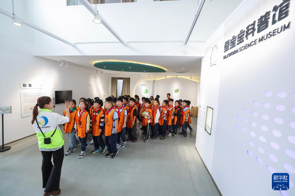 4月15日,参加研学活动的小学生在科普馆了解蚕桑知识。