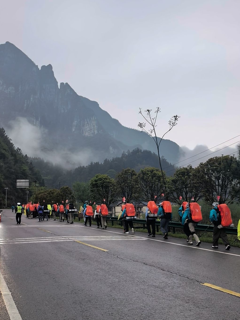 正是雨季,张家界连日阴雨连绵,远处的山峦被云雾笼罩,近处的树木则被雨水冲刷得翠绿,空气十分清新。走过长达2.6公里的沅陵垭隧道,选手们靠边排成一行,一些选手在隧道里自发地唱起歌来:“我的未来不是梦,我认真地过每一分钟……”终于看到隧道那一头的光亮,虽然下着大雨,但选手们忍不住欢呼起来。
