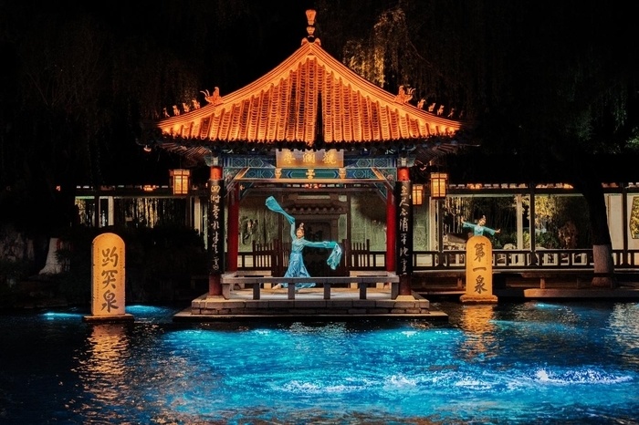 夜游现场,水下灯光系统让趵突泉焕发出璀璨光彩,《趵突泉韵》《清照词宗》《溪亭日暮》三大核心演艺轮番上演,将李清照的婉约词韵、辛弃疾的豪迈情怀与千年泉脉完美交融,“二安”隔空对话的光影场景让千年文脉可触可感。专业讲解员身着汉服,带领众多游客沿东门→龟石广场→漱玉泉→李清照纪念堂→主泉池→白雪楼戏台的路线游览,在光影流转间穿越时空,感受“日间观景、夜间看戏”的全天候泉水体验。目前,趵突泉面向全国大学生施行免票政策,通过下载369公交出行APP申领学子畅游卡,每年可申请两次15天(合计30天)免费乘坐地铁公交和部分景区免票权益。除此之外,景区推出的“白+黑一日通”套票,以实惠价格让市民游客尽享趵突泉昼夜间的双面风华,成为济南文旅从“一日游”向“多日游”转变的核心引擎。