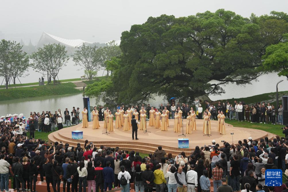 4月15日,游客在温州园博园省市城市展园观看文艺表演。