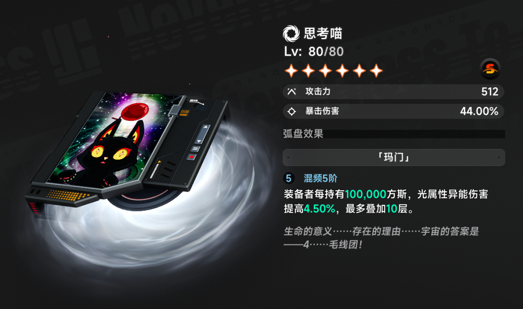 小吱专武与方斯也有联系,高级属性给到暴击伤害,弧盘效果则根据方斯数量提供光属性伤害,当拥有一百万方斯时,就能吃满提供45%光属性增伤,因此小吱带思考喵时需要留一百万方斯给弧盘转模用。未来出其他光属性气态输出的话,也可以用思考喵,未来可期。如何免费获取思考喵?