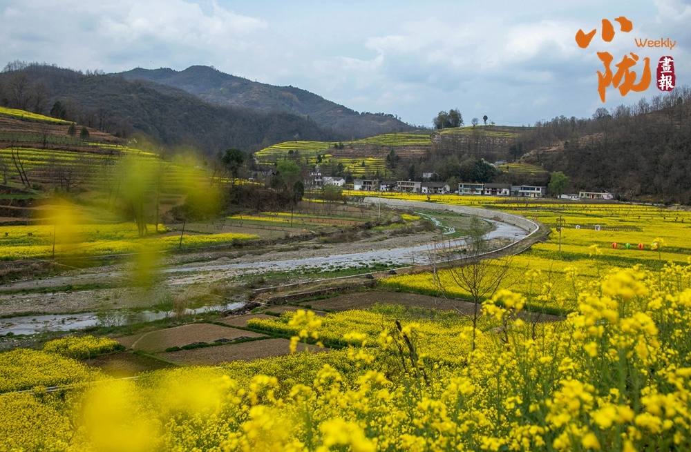 春日的田野被成片的油菜花染成金黄,顺着山势铺展成层层叠叠的花浪。清浅溪流蜿蜒穿过花海,山坳深处,静卧着黛瓦白墙的村落,恰似一幅恬淡的画卷。