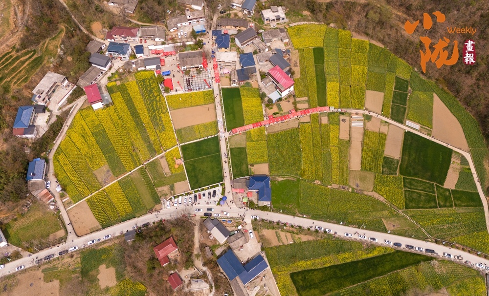 从高空俯瞰,村落被织就成了一幅鲜活的春日拼贴画。金黄的油菜花田与深浅不一的绿田交错,黛瓦农舍错落其间,蜿蜒道路串起烟火与田园,满是蓬勃的春日生机。