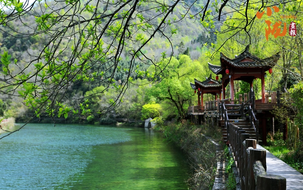 翠绿枝桠垂落,古朴的木质长廊沿岸蜿蜒,飞檐翘角间藏着山野的闲适,远处青山叠翠,春意在林间肆意流淌,每一眼都是江南般的温婉诗意。
