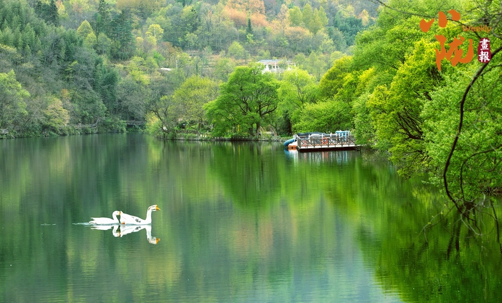澄澈湖面如绿玉铺展,两只白鹅悠然游弋,漾开圈圈涟漪。岸边林木叠翠,山影在水中晕染成朦胧诗行,静泊的游船似在守候一场与山水的温柔邂逅。