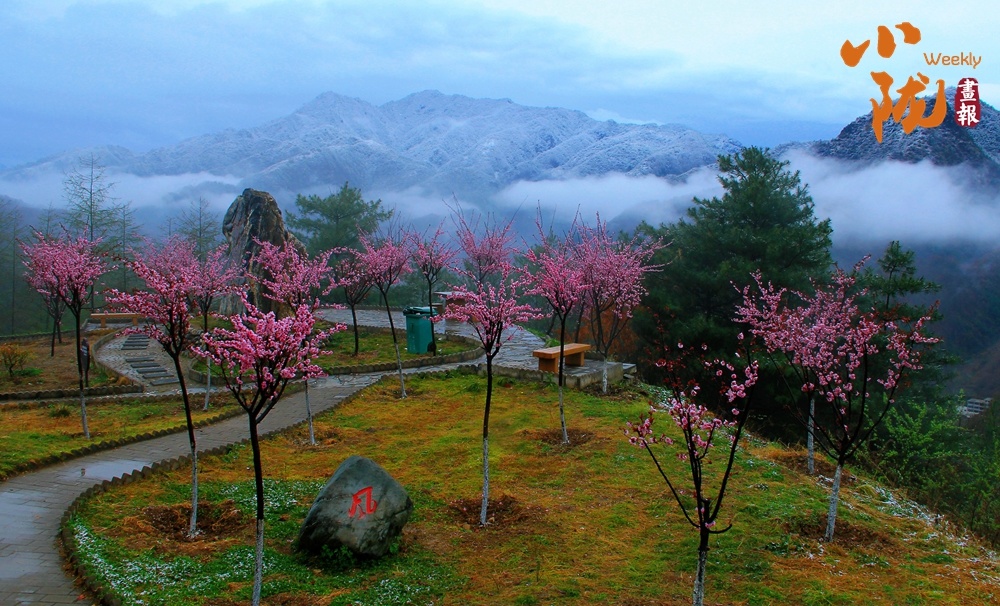 远山覆雪,云雾如纱,梅树开满粉艳的花簇,在清寒里优雅地舒展枝条,与苍劲的山石、蜿蜒的曲径互为映照,放眼望去,像大自然铺开的清雅画卷。