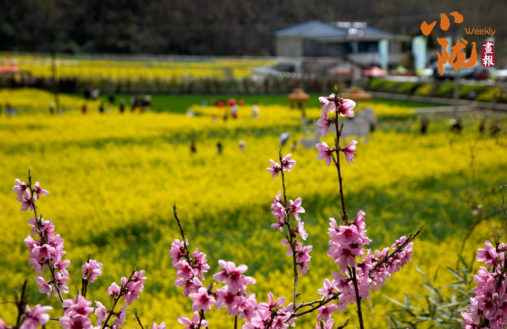 粉桃灼灼,身后是广阔的油菜花海,如铺展的金色绸缎。田埂间游人点缀,远处屋舍隐在绿意里。这方春景,是自然晕染的鲜活诗行,满是烂漫与生机。