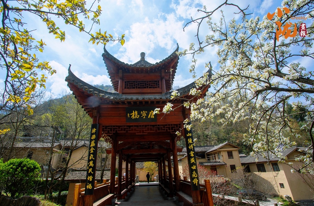 古朴的廊桥立在村口,飞檐翘角间,梨花枝桠轻垂。黛瓦土墙的民居错落于青山绿树间,楹联上的字句藏着古村的烟火与底蕴。这方天地,满是岁月的韵味。