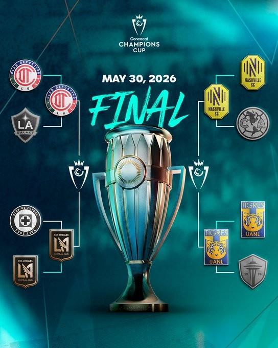 北京时间4月16日,美冠杯四强对阵出炉,洛杉矶vs托卢卡体育,墨西哥老虎vs纳什维尔。